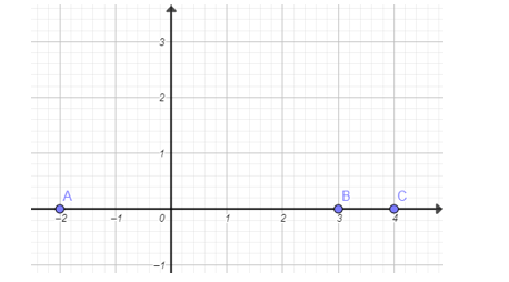 Vẽ một trục tọa độ Oxy và đánh dấu các điểm A(−2; 0), B(3; 0), C(4; 0).