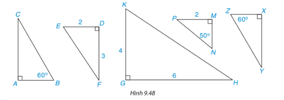 Hãy chỉ ra hai cặp tam giác vuông đồng dạng có trong hình 9.48: