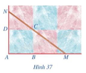Bài toán: Hình 37 minh họa một phần sân nhà bạn Duy được lát bởi các viên gạch hình vuông khít nhau, trong đó các điểm A, B, C, D là bốn đỉnh của một viên gạch. Bạn Duy đặt một thước gỗ trên mặt sân sao cho thước gỗ luôn đi qua điểm C và cắt tia AB tại M, cắt tia AD tại N. Bạn Duy nhận thấy ta luôn có tỉ lệ thức