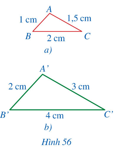 Cho hai tam giác ABC và MNP có AB = 2, BC = 5, CA = 6, MN = 4, NP = 10, PM = 12. Hãy viết các cặp góc tương ứng bằng nhau của hai tam giác trên và giải thích kết quả.