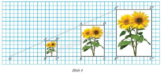 Cho ba tấm ảnh được đặt trên lưới ô vuông như Hình 4. Hãy chỉ ra ba cặp hình, trong mỗi cặp hình này đồng dạng phối cảnh với hình kia và chỉ ra tỉ số đồng dạng tương ứng.