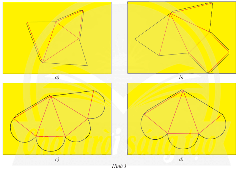 Bước 2. Vẽ các hình tam giác cân và mép dán như Hình la, Hình 1b. Vẽ các hình tam giác cân, các nửa đường tròn và mép dán như Hình 1c, Hình 1d.