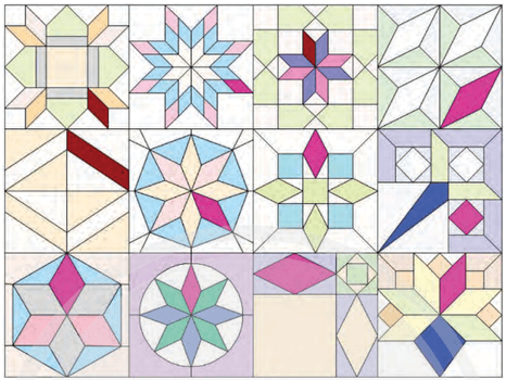 2. Tìm trong mẫu hoa văn các hình ứng với các loại tứ giác đã học: Hình thang cân, hình bình hành, hình thoi, hình chữ nhật, hình vuông, …