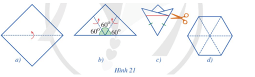 Bạn Đan gấp một tờ giấy (có dạng hình vuông) lần lượt theo Hình 21a và Hình 21b để được Hình 21c, rồi cắt theo đoạn thẳng màu đỏ như ở Hình 21c, sau đó mở ra và được tờ giấy như Hình 21d. Bạn Đan cho rằng đó là một lục giác đều. Theo em, bạn Đan nói đúng hay không?