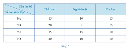 c) Các cột còn lại của Bảng 1 lần lượt cho biết số học sinh tham gia câu lạc bộ Thể thao, Nghệ thuật, Tin học tương ứng với các lớp 9A, 9B, 9C, 9D.