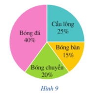 Hoạt động 5 trang 11 Toán 9 Tập 2: Biểu đồ hình quạt tròn ở Hình 9 biểu diễn kết quả thống kê (tính theo tỉ số phần trăm) chọn môn thể thao ưa thích nhất trong bốn môn: Cầu lông, Bóng bàn, Bóng chuyền, Bóng đá của 300 học sinh khối lớp 9 ở một trường trung học cơ sở. Mỗi học sinh chỉ được chọn một môn thể thao khi được hỏi ý kiến.
