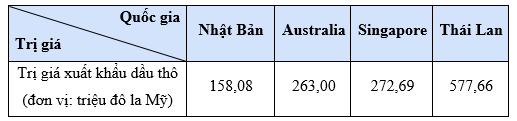 Luyện tập 1 trang 4 Toán 9 Tập 2: Trị giá xuất khẩu dầu thô (đơn vị: triệu đô la Mỹ) của Việt Nam sang Nhật Bản, Australia, Singapore, Thái Lan năm 2021 lần lượt như sau: 158,08; 263,00; 272,69; 577,66.