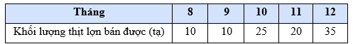 Bài 2 trang 14 Toán 9 Tập 2: Khối lượng thịt lợn bán được trong các tháng 8, 9, 10, 11, 12 năm 2022 của một hệ thống siêu thị lần lượt là: 10 tạ; 10 tạ; 25 tạ; 20 tạ; 35 tạ.