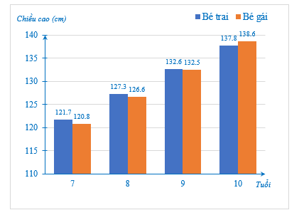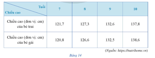 Bài 4 trang 14 Toán 9 Tập 2: Bảng 14 thống kê chiều cao trung bình cho trẻ em từ 7 đến 10 tuổi theo tiêu chuẩn của Tổ chức Y tế Thế giới (WHO):