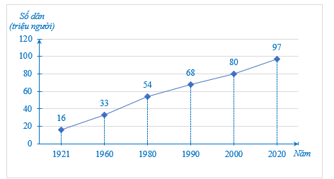 Dân số Việt Nam (đơn vị: người) qua các năm 1921, 1960, 1980, 1990, 2000 và 2020 lần lượt là: 16 triệu; 33 triệu; 54 triệu; 68 triệu; 80 triệu; 97 triệu.