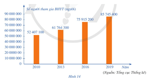 Bài 7 trang 15 Toán 9 Tập 2: Biểu đồ cột ở Hình 14 biểu diễn số người tham gia bảo hiểm y tế (BHYT) của Việt Nam ở một số năm trong giai đoạn từ năm 2010 đến năm 2019.