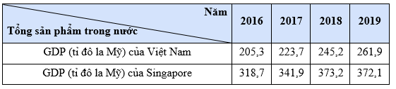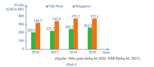 Hoạt động 3 trang 6 Toán 9 Tập 2: Biểu đồ cột kép ở Hình 4 thống kê tổng sản phẩm trong nước (GDP) theo giá hiện hành của Việt Nam và Singapore trong các năm 2016, 2017, 2018, 2019.