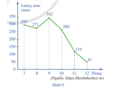 Hoạt động 4 trang 8 Toán 9 Tập 2: Biểu đồ đoạn thẳng ở Hình 6 biểu diễn lượng mưa trung bình sáu tháng cuối năm 2019 tại Thành phố Hồ Chí Minh.