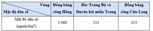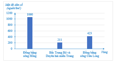 Luyện tập 2 trang 6 Toán 9 Tập 2: Theo Báo cáo tổng điều tra dân số năm 2019, mật độ dân số (người/km2) ở Đồng bằng sông Hồng, Bắc Trung Bộ và Duyên hải miền Trung, Đồng bằng sông Cửu Long lần lượt là: 1 060; 211; 423. Lập bảng thống kê và vẽ biểu đồ cột biểu diễn các số liệu đó.