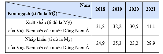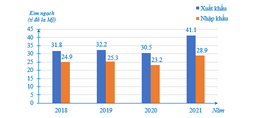 Luyện tập 3 trang 8 Toán 9 Tập 2: Kim ngạch xuất khẩu và nhập khẩu của Việt Nam với các nước Đông Nam Á (đơn vị: tỉ đô la Mỹ) trong các năm 2018, 2019, 2020, 2021 lần lượt là: 31,8 và 24,9; 32,2 và 25,3; 30,5 và 23,2; 41,1 và 28,9.