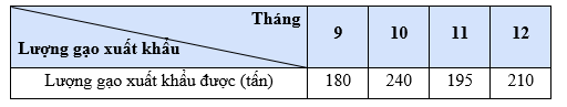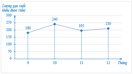 Luyện tập 4 trang 10 Toán 9 Tập 2: Số lượng gạo xuất khẩu được (đơn vị: tấn) của một doanh nghiệp trong các tháng 9, 10, 11, 12 lần lượt là: 180; 240; 195; 210. Vẽ biểu đồ đoạn thẳng biểu diễn các số liệu đó.
