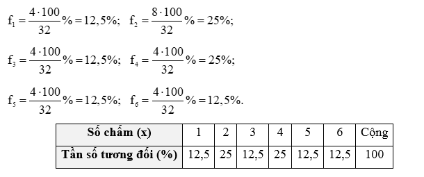 Các giá trị 1; 2; 3; 4; 5; 6 lần lượt có tần số, tần số tương đối là: