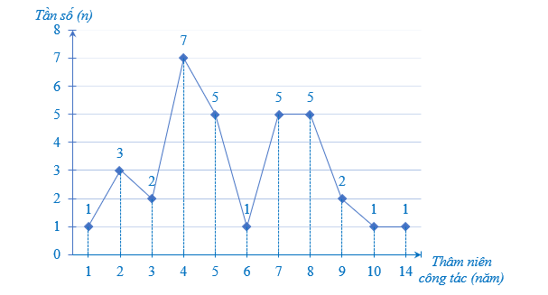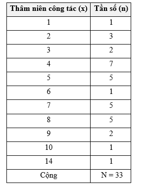 Luyện tập 1 trang 17 Toán 9 Tập 2: Thống kê thâm niên công tác (đơn vị: năm) của 33 nhân viên ở một công ty như sau: