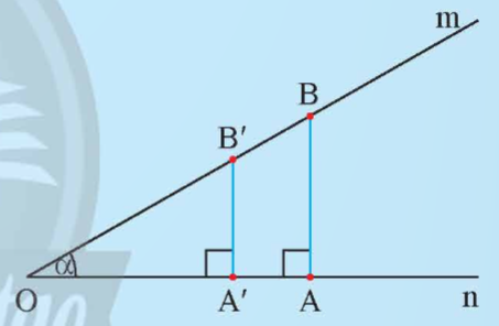 \(\widehat{mOn} =\alpha\). Lấy hai điểm A và A' trên On, kẻ hai đường thẳng qua A và A' vuông góc với On và Om lần lượt tại B và B'.