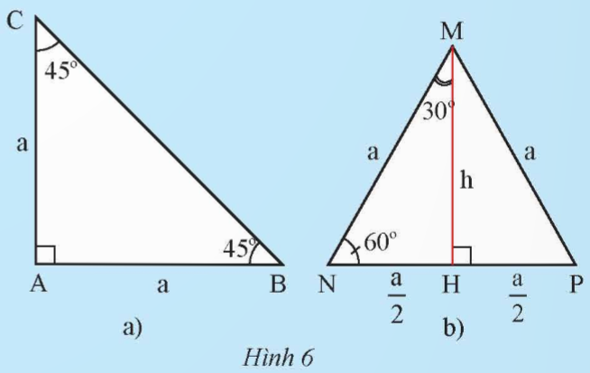 b) Cho tam giác đều MNP có cạnh bằng a (Hình 6b). Tính độ dài đường cao MH theo a, rồi tính các tỉ số lượng giác của góc 30o và góc 60o.
