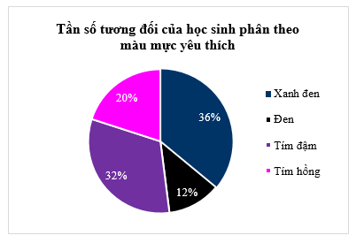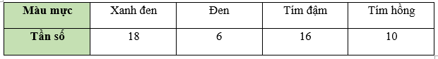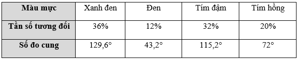 Thực hành 2 trang 36 Toán 9 Tập 2: Bạn Mai phỏng vấn một số bạn học sinh cùng trường về màu mực mỗi bạn yêu thích nhất. Kết quả được cho ở bảng sau: