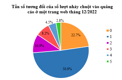 Biểu đồ hình quạt tròn biểu thị tần số tương đối của số lượt nháy chuột vào quảng cáo ở một trang web tháng 12/2022.