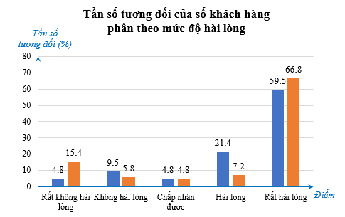 Biểu đồ cột thể hiện tần số tương đối của số khách hàng phân theo mức độ hài lòng: