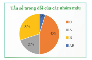 Khám phá 2 trang 34 Toán 9 Tập 2: Khảo sát ngẫu nhiên 200 người về nhóm máu của họ. Kết quả thu được thể hiện ở biểu đồ hình quạt tròn như hình bên.