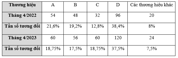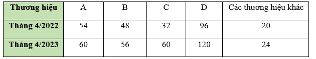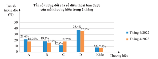 − Nếu so sánh sự tăng trưởng theo tỉ lệ phần trăm số điện thoại bán được vào tháng 4/2023 so với cùng kì năm 2022 thì thương hiệu C tăng trưởng cao nhất (tăng 87,5%), thương hiệu A tăng trưởng thấp nhất (tăng 11,1%).