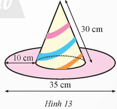 Một cái mũ chú hề có kích thước như Hình 13. Hãy tính tổng diện tích giấy làm nên chiếc mũ (không tính phần hao hụt, kết quả làm tròn đến hàng đơn vị).