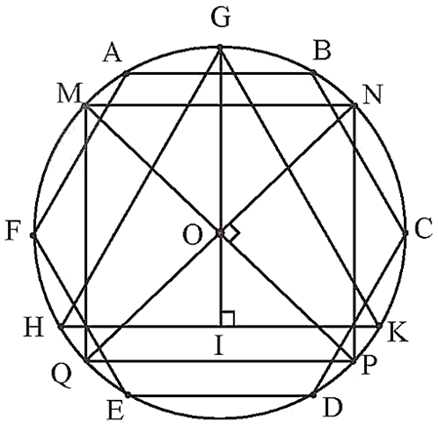 a) Hình tam giác đều GHK, hình vuông MNPQ, hình lục giác đều ABCDEF có các đỉnh nằm trên (O; R) được vẽ như hình dưới đây.