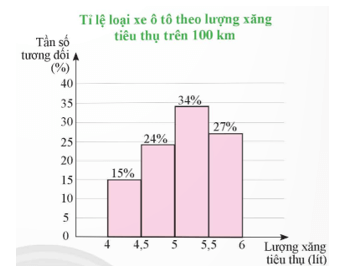Bài 1 trang 48 Toán 9 Tập 2: Một doanh nghiệp sản xuất xe ô tô khảo sát lượng xăng tiêu thụ trên 100 km của một số loại xe ô tô trên thị trường. Kết quả khảo sát 100 chiếc xe được biểu diễn trong hình bên.