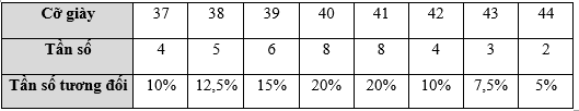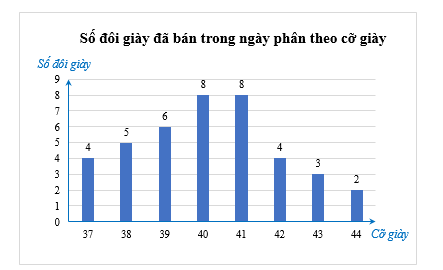 Bài 5 trang 50 Toán 9 Tập 2: Một cửa hàng ghi lại cỡ của các đôi giày đã bán trong một ngày ở bảng sau: