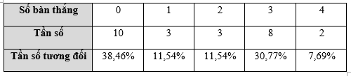 Bài 6 trang 50 Toán 9 Tập 2: Số bàn thắng một đội bóng ghi được trong 26 Trận đấu của Giải vô địch quốc gia được ghi lại như sau: