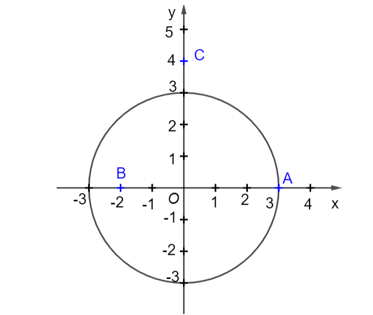 Trong mặt phẳng tọa độ Oxy, cho các điểm A(3; 0), B(−2; 0), C(0; 4). Vẽ hình và cho biết trong các điểm đã cho, điểm nào nằm trên, điểm nào nằm trong, điểm nào nằm ngoài đường tròn (O; 3)?