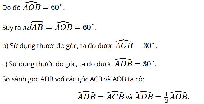 c) Lấy điểm D tùy ý nằm trên cung ACB. Đo góc ADB và so sánh với các góc ACB và AOB.