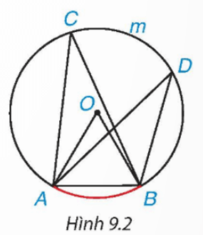 Vẽ đường tròn tâm O có bán kính bằng 2cm và dây cung AB có độ dài bằng 2cm. Lấy một điểm C tùy ý nằm trên cung lớn AmB (H.9.2).