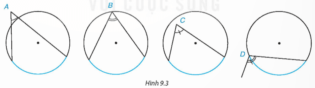 Hãy cho biết số đo góc nội tiếp tìm được trong Hình 9.3 ở Ví dụ 1, biết rằng số đo của các cung màu xanh trong hình đều bằng