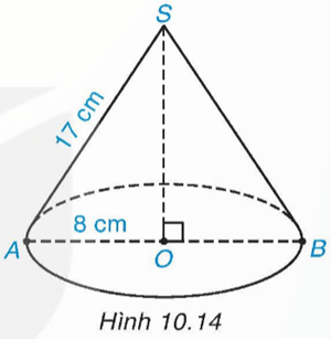 Khi cho tam giác SOA vuông tại O quay quanh cạnh SO một vòng, ta được một hình nón. Biết OA = 8 cm, SA = 17 cm (H.10.14).