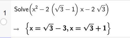 Ta nhập Solve (x^2 – 2(sqrt(3) – 1) – 2sqrt(3) = 0), ta thu được kết quả như hình vẽ.
