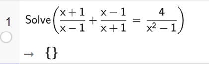 Ta nhập Solve ((x + 1)/(x – 1) + (x – 1)/(x + 1) = 4/(x^2 – 1)), ta thu được kết quả như hình vẽ.