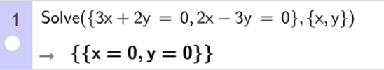 Ta nhập Solve ({3x + 2y = 0, 2x – 3y = 0}, {x, y}), ta thu được kết quả như hình vẽ.