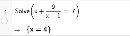 Ta nhập Solve (x + 9/(x – 1) = 7), ta thu được kết quả như hình vẽ.