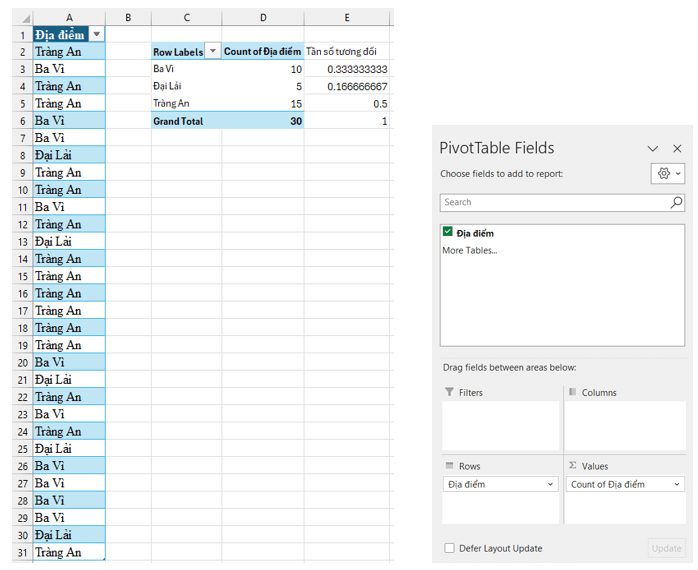 Bước 1. Nhập dữ liệu trên vào vùng dữ liệu A2 : A31, ô A1 là tên cột địa điểm đi dã ngoại.