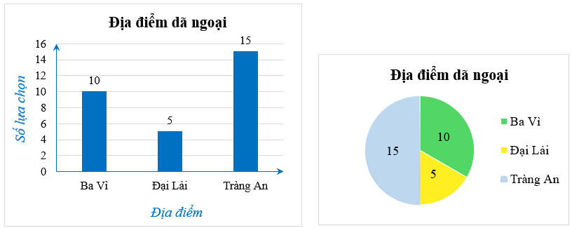 Hỏi ý kiến của các bạn trong lớp về địa điểm đi dã ngoại với ba lựa chọn: Tràng An, Ba Vì, Đại Lải thu được kết quả sau: