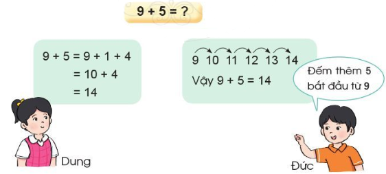 Bạn Đức thực hiện phép tính 9 + 5 bằng cách: đếm thêm 5 bắt đầu 9 (10, 11, 12, 13, 14) từ đó tìm được kết quả là 14.