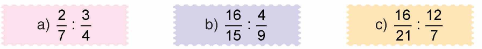 \(c)\frac{16}{21}:\frac{12}{7}=\frac{16}{21}\times\frac{7}{12}=\frac{16\times7}{21\times12}=\frac{4}{9}\)
