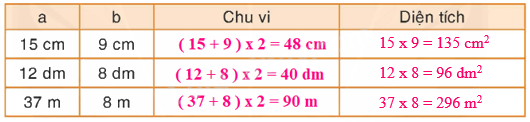Câu 3. Cho hình chữ nhật có chiều dài là a và chiều rộng là b. Hãy tìm số đo thích hợp thay cho dấu ? ở bảng sau: