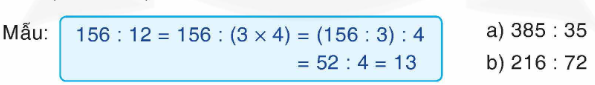 a) 385 : 35 = 385 : (7 x 5) = (385 : 7) : 5 = 55 : 5 = 11