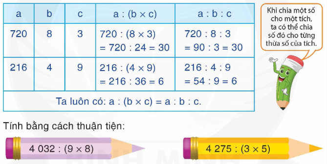 - Khi chia số tròn chục, tròn trăm, tròn nghìn, ... cho 10, 100, 1 000, ... ta bỏ bớt đi một, hai, ba, ... chữ số 0 ở bên phải số đó.